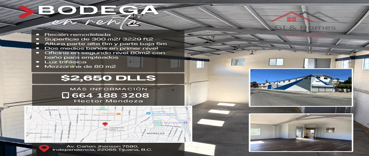 En renta bodega comercial con excelente ubicación en zona centro a unas cuadras de av revolución -recién remodelada -superficie de 300 m2 -altura parte alta 6m y parte baja 5m -dos medios baños en pr...