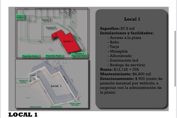 Local comercial en renta ubicado al interior de plaza san pedro - humberto lobo listo para entrar. acabado y equipado. planta baja: 87 m2 $13,125 + iva $4,800 mantenimiento +iva $500 estacionamiento...