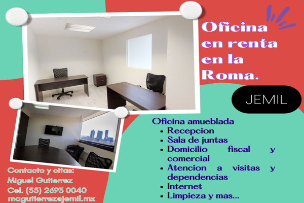 Oficina en renta en la roma ¡excelente ubicación, entre insurgentes y av. cuauhtémoc oficina amueblada: • escritorios • sillas • archivero servicios: • recepción • domicilio fiscal y comercial • s...
