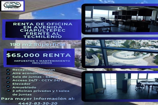 Renta de oficinas en avenida chapultepec frente a tecmilenio. $64, 000 incluye impuestos y mantenimiento. * recepción e internet * amueblado * 196 m2 * 2 cajones de estacionamiento * sala de...