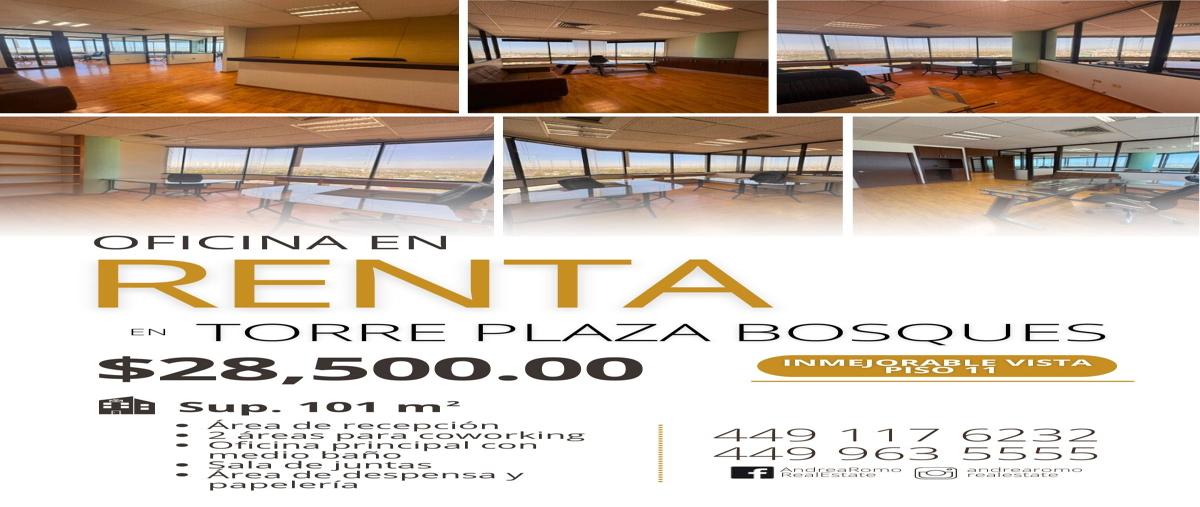 Oficina en renta en el piso once de torre plaza bosques, al norte de la ciudad, sobre av. universidad y av. aguascalientes norte. con hermosa vista cuenta con área de recepción y sala de espera, 3 ofi...
