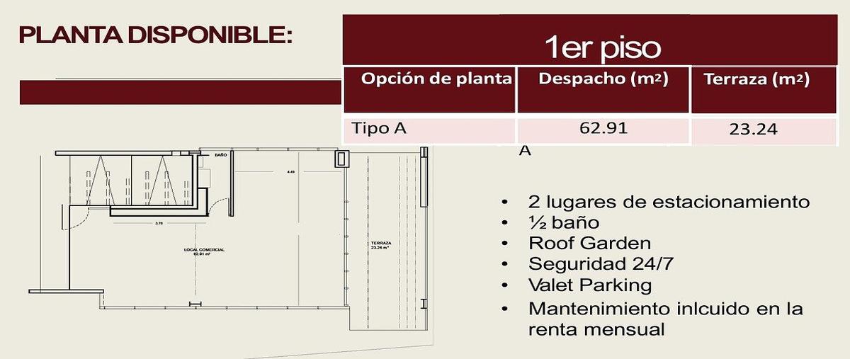 Oficina en primer piso en edificio de oficinas premium, cuenta con un total de 86 m2, incluida una terraza privada de 23 metros cuadrados. cuenta con: 2 lugares de estacionamiento, medio baño, 3 priva...