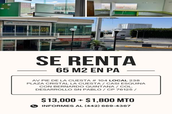 Av pie de la cuesta # 104 local 238 plaza cristal la cuesta / casi esquina con bernardo quintana / col. desarrollo sn pablo / cp 76125 /son 65 mts2 / super bien ubicado el local 2 cajones de estac...