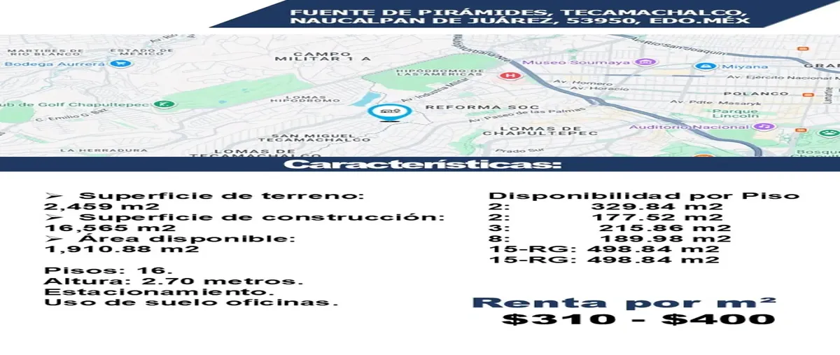 Nocnok id: nn-st1000100. características: - superficie de terreno: 2,459 m2 - superficie de construcción: 16,565 m2 - área disponible: 1,910 m2 - pisos: 16. - altura: 2 metros. - estacionamient...