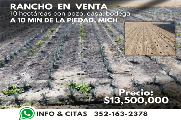 Rancho en venta a 10 minutos de la piedad 10 hectáreas con pozo incluye 2 has con agave y limón con riego casa del rancho bodega instalaciones para engorda de cerdos a puerta cerrada precio: $13 mdp...