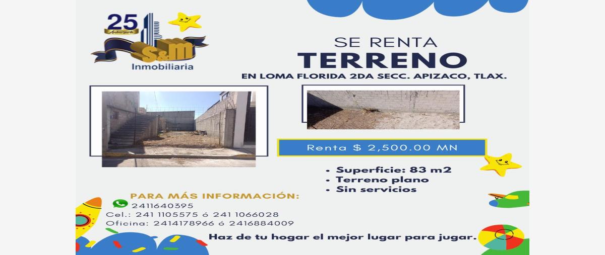 Nocnok id: mx23-oq3775. s&m inmobiliaria renta terreno plano ubicado en loma florida, apizaco, tlaxcala. cercano a bodega aurrera, mercado de loma verde, oxxo, plaza apizaco, a 5 minutos de la ciudad ...