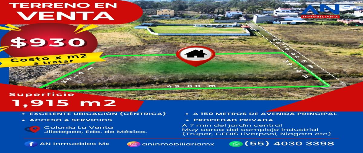 Terreno en venta!! aprovecha está oferta excelente precio $900 pesos por m2 (a negociar) superficie: 1,915 m2 ubicado en col. la venta, jilotepec, edo. de méxico, con acceso por calle privada de 6 met...