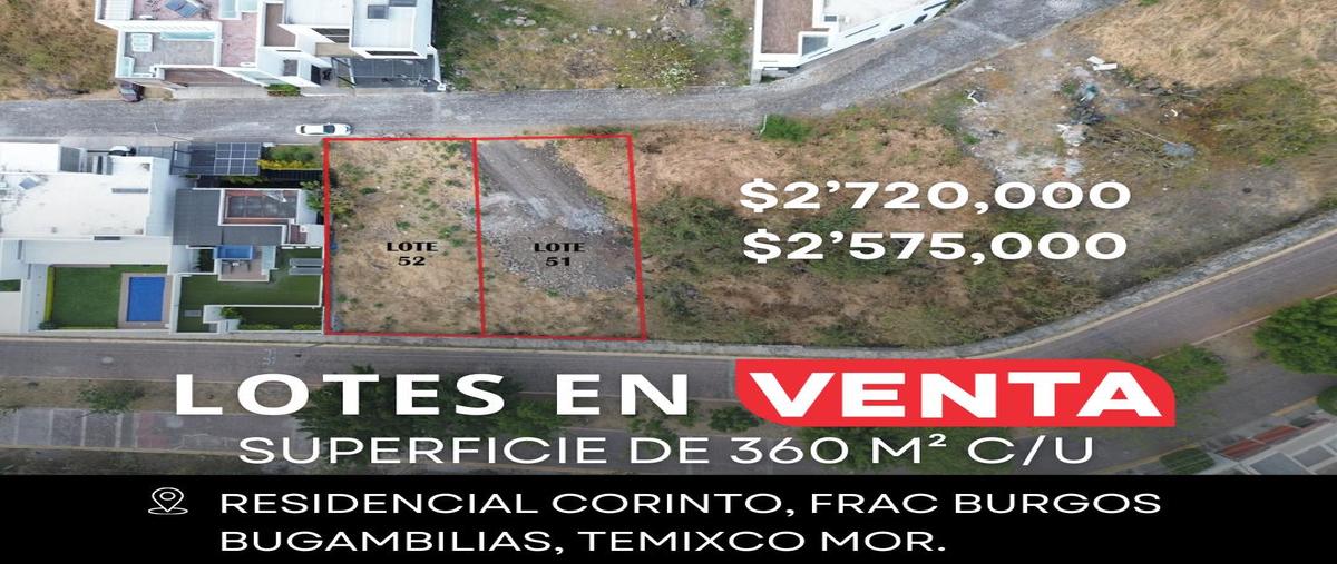 Últimos 2 lotes disponibles en residencial corinto - la cimafrac burgos bugambilias, temixco morelossuperficie: 360 m2 privativos +121 m2 de indivisos dando un total de 481 m2medidas: 12m de fre...