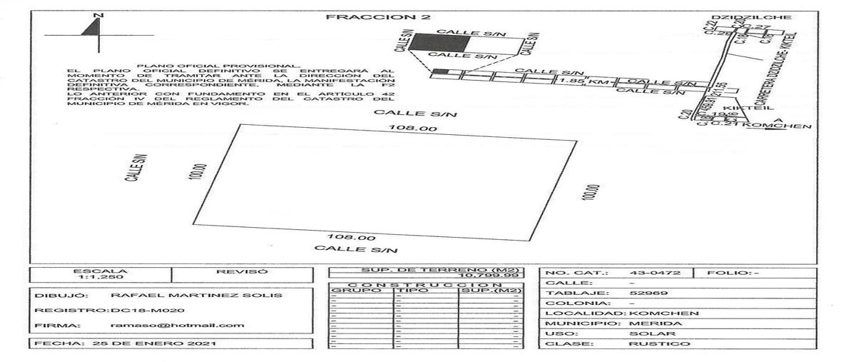 Detalles: terreno en venta en komchen de una hectárea. superficie total 10,799 m2 (100 x 108 metros) descripción: accesos a 300 metros, propiedad privada precio por m2: $350. id: eb-it2066