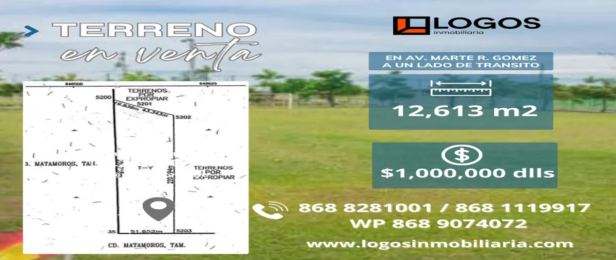 Nocnok id: mx25-kf10080. ?terreno en venta ? ?en ave. marte r. gomez, a un lado de transito municipal. ?tipo: terreno ?operación: venta ?precio: $1,000,000 dlls ?superficie: 12,613 m2