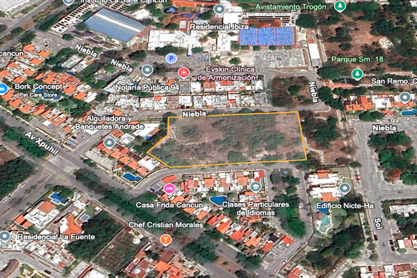 Terreno ubicado en la sm18 , polígono irregular con frentes al parque, y a la calle niebla 102 m2 y escarcha 91 m2, a una cuadra de avenida yaxchilán. cerca de la prepa la salle, el estadio de beisbol...