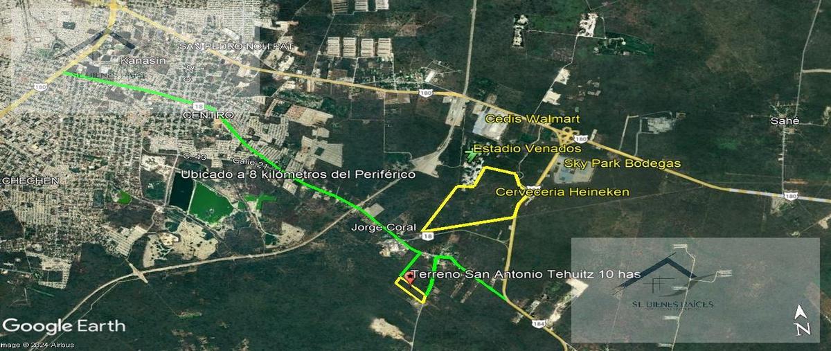 Terreno en san antonio tehuitz, kanasín, mérida yucatán terreno de 100,000 m2, 10 hectáreas frente: 172 m. fondo: 628 m.• cfe al frente del terreno • ubicado a 8 kilómetros de mérida, y a 2 de l...