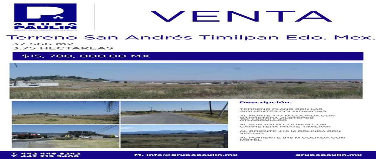 Terreno plano con las siguientes colindancias: al norte 177 m colinda con carretera jilotepec atlacomulco al sur 100 m colinda con carretera phate-timilpan al oriente 413 m colinda con vecino al ponie...