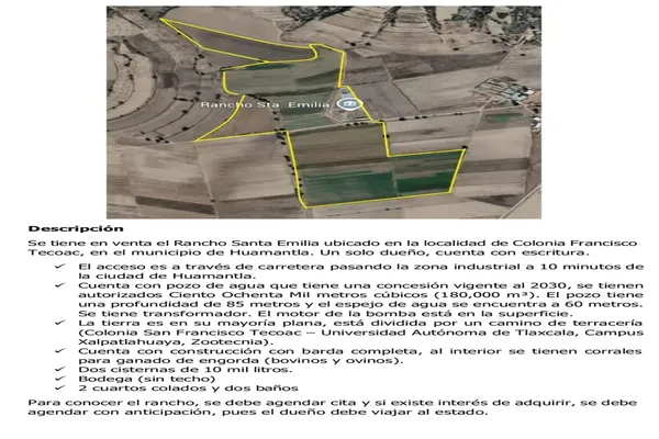 Nocnok id: nn-gm1000145. se tiene en venta el rancho santa emilia ubicado en la localidad de colonia francisco tecoac, en el municipio de huamantla. un solo dueño, cuenta con escritura. el acceso es ...