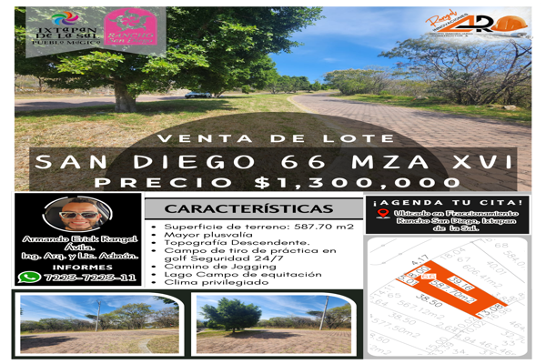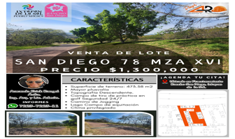 Terreno habitacionalVenta$1,300,000 MXNTerreno en venta, HERMOSO LOTE SAN DIEGO 66 #XVI, Col. El Salitre, Ixtapan de la Sal, México, México, C.P. 51924, ID: 27459748 587 m2 Teléfono