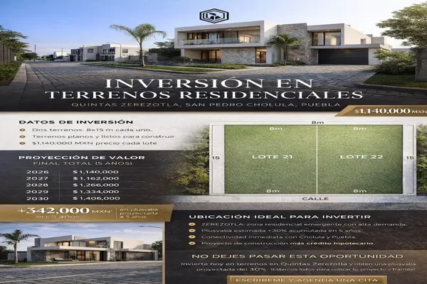Terreno habitacionalVenta$1,140,000 MXNVenta de terreno en Calle 15 sur y Avenida Juan blanca #Na, Col. Las Quintas, San Pedro Cholula, Puebla, México, C.P. 72776, ID: 30922182 120 m2 Mascota Vigilancia CCTV