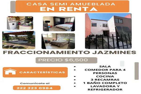 CasaRenta$6,500 MXNSe renta casa FRACCIONAMIENTO JAZMINES #1Int. 1, Col. Loma Bonita Sur, Puebla, Puebla, México, C.P. 72495, ID: 29864097 3 Recámaras 1 Baño 220 m2 1 Estacionamiento Vigilancia