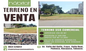 Terreno comercialVenta$1,800,000 MXNVenta de terreno comercial en Av. Valle del Golfo #1, Col. Pomoca Valle Real, Nacajuca, Tabasco, México, C.P. 86247, ID: 29195636 450 m2