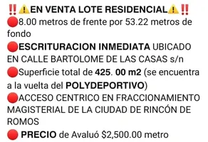 Terreno habitacionalVenta$1,065,000 MXNVenta de terreno en Fray Bartolomé de las Casas #0, Col. Magisterial, Rincón de Romos, Aguascalientes, México, C.P. 20410, ID: 29164741 425 m2