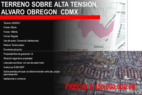 Terreno comercialVenta$450,000,000 MXNTerreno comercial en venta, alta tencion #140, Col. Olivar del Conde 1a Sección, Álvaro Obregón, DF / CDMX, México, C.P. 01400, ID: 30576744 1 Recámara 24000 m2