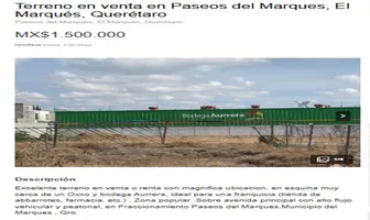 Terreno comercialVenta$1,550,000 MXNSe vende terreno comercial Av paseo del marqués #13, Col. Paseos del Marques, El Marqués, Querétaro, México, C.P. 76245, ID: 30640180 4 Recámaras 265 m2 Lavandería Cisterna C. servicio