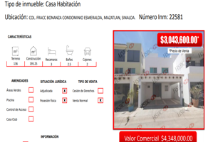 CasaVenta$3,043,600 MXNfraccionamiento Bonanza condominio Esmeralda, Col. Esmeralda, Mazatlán, Sinaloa, México, C.P. 82164, ID: 30197976 1 Recámara 1 Baño 195 m2