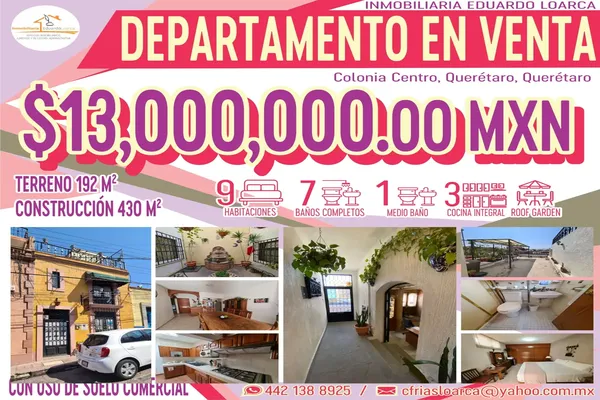 DepartamentoVenta$13,000,000 MXNAv. 20 de Noviembre #37, Col. Centro, Querétaro, Querétaro, México, C.P. 76000, ID: 26864119 9 Recámaras 8 Baños 430 m2 Amueblado Lavandería A/C...