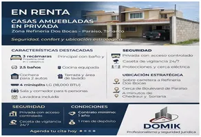 CasaRenta$10,500 MXNSe renta casa Privanza #n/a, Col. Quintín Arauz, Paraíso, Tabasco, México, C.P. 86608, ID: 30498025 3 Recámaras 3 Baños 140 m2 2 Estacionamientos Amueblado A/C