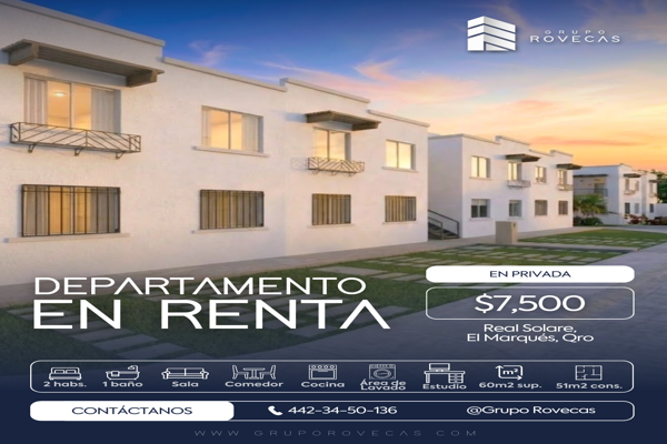 DepartamentoRenta$6,800 MXNSotavento Real Solare, Col. Real Solare, El Marqués, Querétaro, México, C.P. 76246, ID: 31092947 2 Recámaras 1 Baño 50 m2