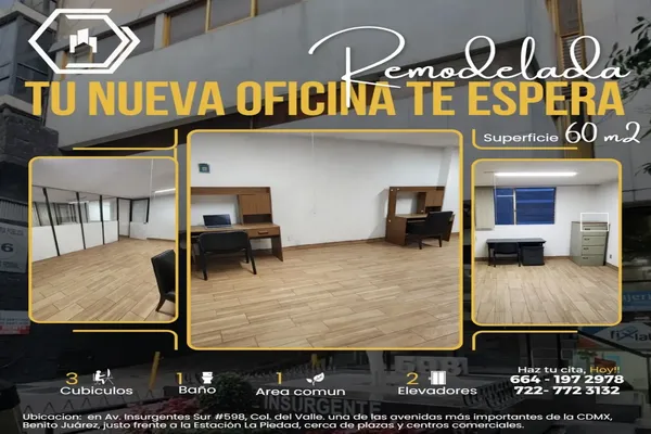 OficinaRenta$17,250 MXNSe renta oficina en Av Insurgentes #598Int. 204, Col. Del Valle Norte, Benito Juárez, DF / CDMX, México, C.P. 03103, ID: 29194394 4 Recámaras 60 m2 1 Estacionamiento Alberca Terraza Vigilancia...