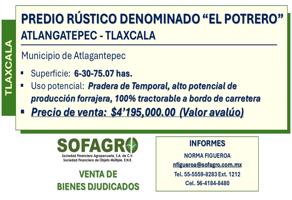 Terreno comercialVenta$4,195,000 MXNTerreno comercial disponible en venta en PREDIO RUSTICO DENOMINADO EL POTRERO #-Int. -, Col. Atlangatepec, Atlangatepec, Tlaxcala, México, C.P. 90410, ID: 30421427 630750 m2
