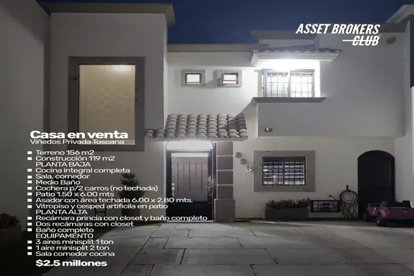 CasaVenta$2,500,000 MXNCasa en venta disponible en Sin calle #S/N, Col. Viñedos Residencial, Ahome, Sinaloa, México, C.P. 81228, ID: 31020612 3 Recámaras 3 Baños 119 m2 2 Estacionamientos Luz A/C
