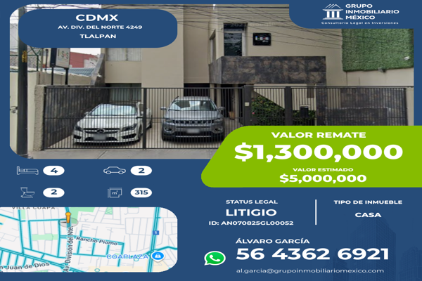 CasaVentaREMATE$1,300,000 MXNVenta de casa Av. División del Nte. 4249, Coapa, Prados Coapa 2da Secc, Tlalpan, 14357 Ciudad de México, CDMX #4249, Col. Prado Coapa 2A Sección, Tlalpan, DF / CDMX, México, C.P. 14357, ID: 30584733 4 Recámaras 2 Baños 315 m2