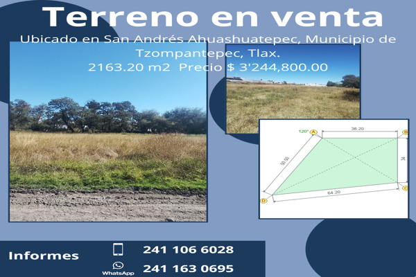 Terreno habitacionalVenta$3,244,800 MXNSe vende terreno C las fincas #s/n, Col. San Andrés Ahuashuatepec, Tzompantepec, Tlaxcala, México, C.P. 90491, ID: 30494579 2163 m2