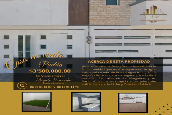 CasaVenta$2,300,000 MXNCasa en venta disponible en Sin nombre de calle, Col. Vicente Guerrero, Puebla, Puebla, México, C.P. 72470, ID: 30432652 3 Recámaras 3 Baños 180 m2 2 Estacionamientos Mascota Luz...