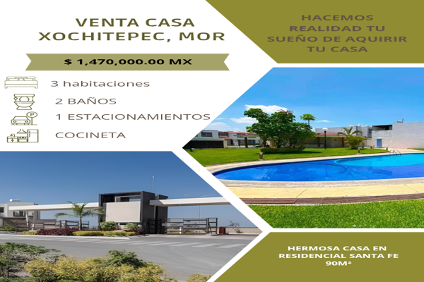 CasaVenta$1,600,000 MXNCasa disponible en venta en 62794 Xochitepec, Mor., Col. Vista Santa Fe, Xochitepec, Morelos, México, C.P. 62794, ID: 31027455 3 Recámaras 2 Baños 90 m2 Alberca Mascota Lavandería...